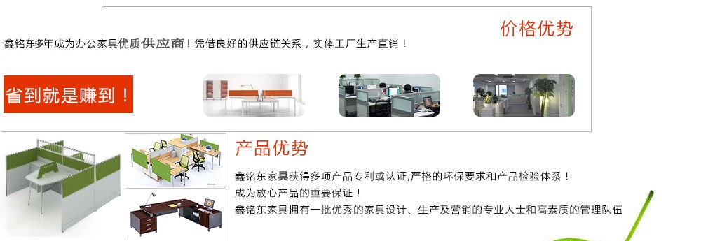 深圳市鑫銘東家具有限公司深圳市鑫銘東家具有限公司專(zhuān)業(yè)銷(xiāo)售各類(lèi)辦公家具!產(chǎn)品涉及多種系列,如:班臺(tái)、班椅、屏風(fēng)、會(huì)議桌、會(huì)議椅、辦公沙發(fā)、茶幾、辦公桌、文件柜、電腦桌椅、各式餐臺(tái)、餐椅、書(shū)柜等辦公家具。 鑫銘東家具擁有一批優(yōu)秀的家具設(shè)計(jì)、生產(chǎn)及營(yíng)銷(xiāo)的專(zhuān)業(yè)人士和高素質(zhì)的管理隊(duì)伍。銘東家具以"先難后易"之戰(zhàn)略,在產(chǎn)品結(jié)構(gòu)、產(chǎn)品質(zhì)量及服務(wù)水平方面,均推陳出新,力求完善,精益求精。使我們的產(chǎn)品質(zhì)量保持在國(guó)內(nèi)外家具潮流的先進(jìn)水平,力求滿足客戶的特殊需求。鑫銘東家具多年來(lái)致力于環(huán)保、實(shí)用家具的設(shè)計(jì)與開(kāi)發(fā),集生產(chǎn)、銷(xiāo)售、服務(wù)于一體。本著"以人為本"的設(shè)計(jì)理念,大量開(kāi)發(fā)符合人體工程學(xué)的各種產(chǎn)品,以"誠(chéng)信為本"的質(zhì)量方針,真材實(shí)料,認(rèn)認(rèn)真真做產(chǎn)品,實(shí)實(shí)在在做人。鑫銘東家具更致力于創(chuàng)造"零維修率"的制造境界,實(shí)現(xiàn)"沒(méi)有維修的服務(wù)才是最好服務(wù)"的口號(hào)》了解更多 |